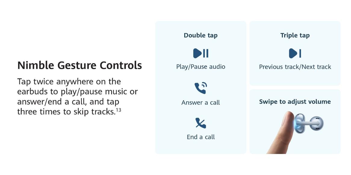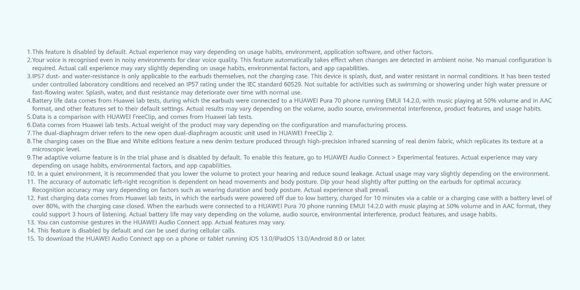 | Battery | Battery Capacity Eearbuds: 60 mAh (Typical capacity each) Charging case: 537 mAh (Typical capacity) Charging Method Wireless charger: up to 3 W Wired charging: USB Type-C Port, 5V 1.5A Charging Time* Wired charging: Charging case only, about 50 minutes; Earbuds and charging case, about 60 minutes; Charging case to charge the earbuds, about 40 minutes. Wireless charging: Charging case only, about 150 minutes. Battery Life** Music playback: 9 hours after a full charge and 38 hours with a fully charged charging case. Voice calling: 6 hours after a full charge and 25 hours with a fully charged charging case |