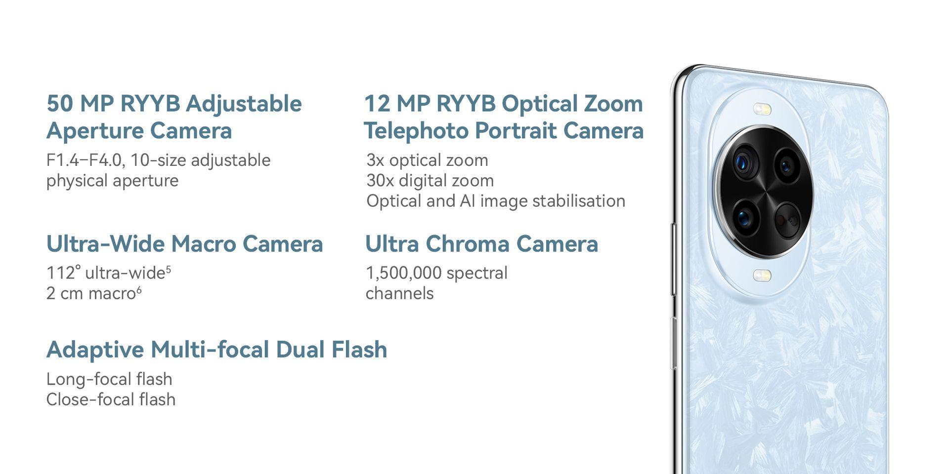 | Triple(Main Camera) | 50 MP, f/1.4-4.0, 24mm (wide), PDAF, OIS 12 MP, f/2.4, 69mm (telephoto), PDAF, OIS, 3x optical zoom 8 MP, f/2.2, 16mm, 112˚ (ultrawide), AF |