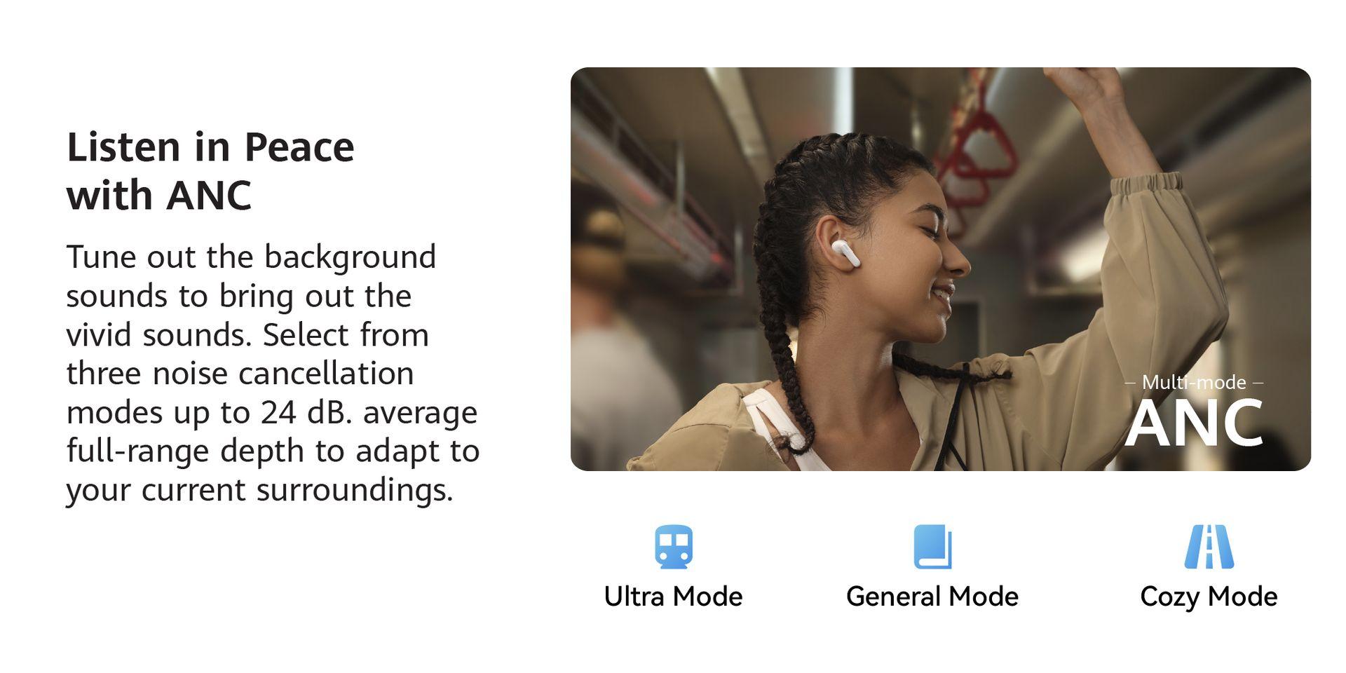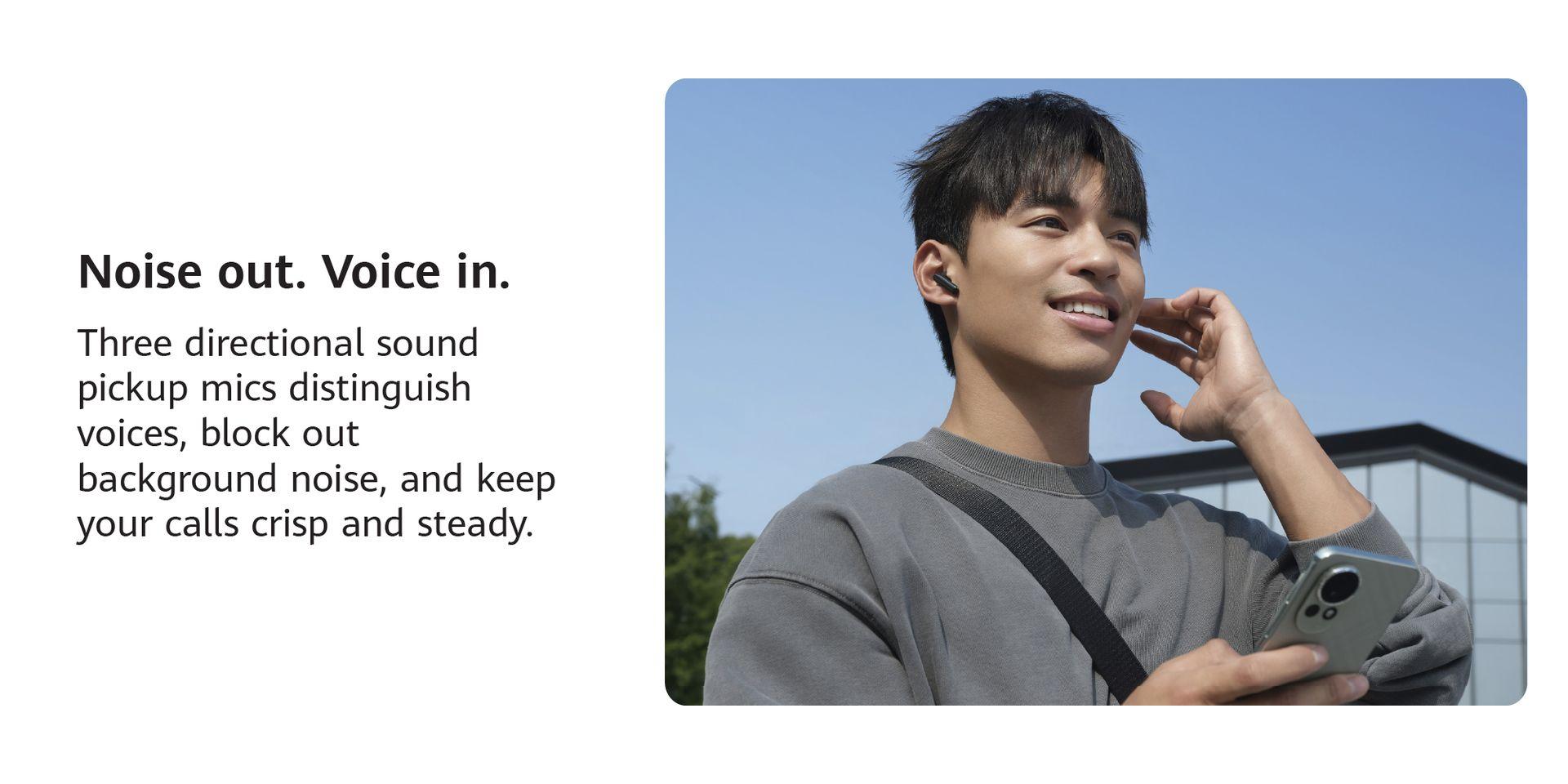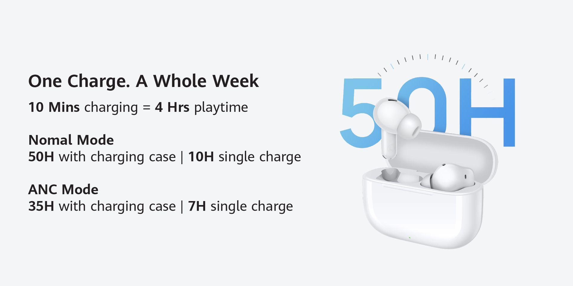 | Battery | Rated capacity Battery type: Lithium-ion polymer battery Single earbud: 41 mAh Charging case: 510 mAh Charging mode Wired charging:USB Type-C Charging Duration Wired charging: approx. 110 mins (only the charging case)* approx. 110 mins (with the earbuds in the charging case)* approx. 60 mins (when the charging case charges the earbuds)* *Battery life and charging data come from Huawei labs with the following testing conditions: volume set to 50%, AAC format used, and default settings for other functions. The test results are for reference only. Actual usage may vary depending on the volume level, audio source, connected devices, environmental interference, enabled features, and usage habits. Battery life Music playback (with noise cancellation enabled): 7 hours after a full charge and 35 hours when used with the charging case* Music playback (with noise cancellation disabled): 10 hours after a full charge and 50 hours when used with the charging case** Voice calling (with noise cancellation enabled): 5 hours after a full charge and 25 hours when used with the charging case* Voice calling (with noise cancellation disabled): 6 hours after a full charge and 30 hours when used with the charging case** *Battery life data comes from Huawei lab tests, in which audio was played at a 50% volume level and with ANC disabled in AAC mode, and while using a HUAWEI Pura 70. The default settings were used for other features. Actual battery life may vary depending on the volume level, audio source, environmental interference, product features, and usage habits. **Battery life data comes from Huawei lab tests, in which audio was played at a 50% volume level and with Wind noise reduction mode disabled but ANC enabled in AAC mode, and while using a HUAWEI Pura 70. The default settings were used for other features. Actual battery life may vary depending on the volume level, audio source, environmental interference, product features, and usage habits. |