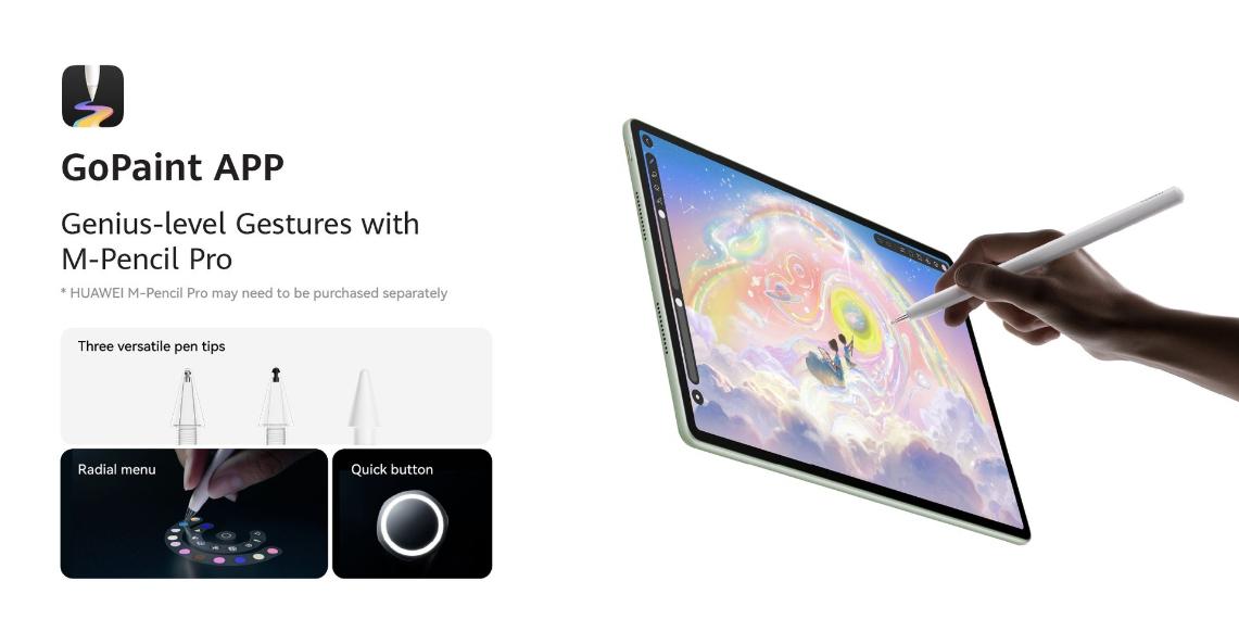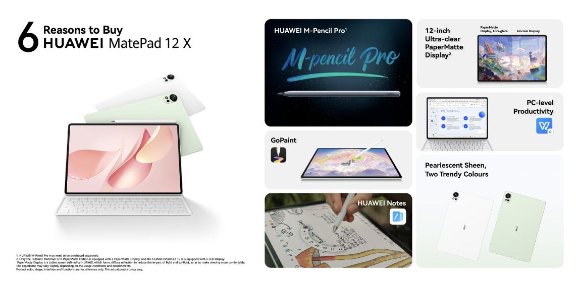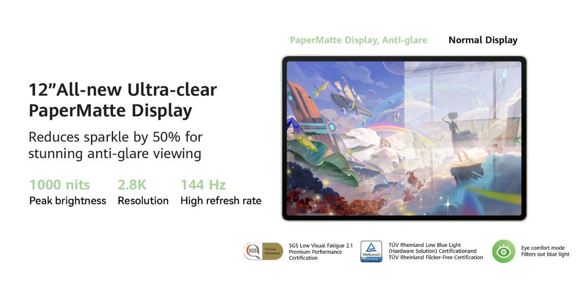 | Display | Size 12 inches* Type HUAWEI PaperMatte Display (IPS) Resolution 2800 × 1840, 280 PPI Screen-to-body Ratio 88%** Screen Colour 16.7 million colours, P3 wide colour gamut Brightness 1000 nits*** |